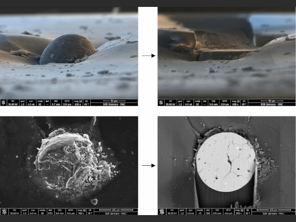 The process uses a CO2 laser as a heat source to melt the glass fibers, here a 400 µm diameter fused silica glass fiber, and fuse them onto a fused silica glass substrate. The CO2 laser radiation is absorbed locally by the glass material. The absorption causes the amorphous glass lattice to vibrate until the lattice bonds are gradually broken and the glass viscously melts. At a viscosity of 4 dPas and below, glass enters the processing point where glass can be processed well.