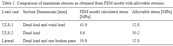 The results of the model showed that the stresses in all three situations stayed below the allowable stresses as shown in table 1. The allowable stresses were calculated from Dutch building code NEN 2608: 2014. The stress contour plot for ULS-1 load combination case is shown in figure 11.