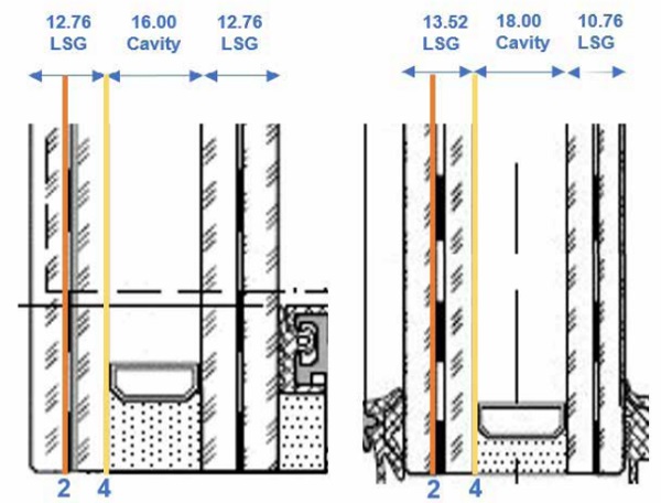 The fritting and solar control coating are most effective on the outer leaf. Pilkington and Interpane can produce monolithic glass with both the frit and solar control coating on the same surface (surface #2). However, Guardian do not recommend applying frit to the same surface as their SNx 50/23 coating; they would require a laminated construction to the outer leaf with the fritting on surface #2 and their triple silver solar coating on surface #4.