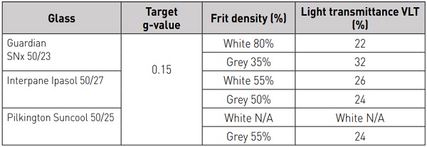 With the application of 35% ceramic frit to the Guardian glass, the 0.15 g-value requirement can be achieved. The Interpane and Pilkington glass have much larger frit requirement at 50% to achieve the 0.15 g-value but they do not meet the light transmittance requirement of minimum 32%.
