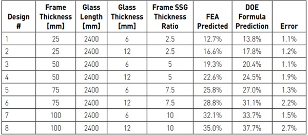 A few cold bent glass designs with 2400mm glass length and 60 mm glass deflection, both parameters being outside the DOE study range, are also evaluated for their suitability using the Fitted Design Formula, as shown in Table 5. Even when the glass size and cold bent deflection exceed the range of the DOE study, the predicted peak strain by the design formula (Equation 1) remains close to the peak strain predicted by the FEA based numerical modeling, as shown in Table 6 and Figure 7. This confirms the usefulness of the Design formula for early-stage SSG joint design evaluation before performing extensive numerical modeling.