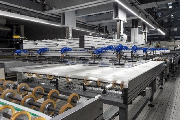 The bottom glass moves forwards, while the PVB sheeting is unwound. A robot arm ensures both movements happen at the same linear speed.