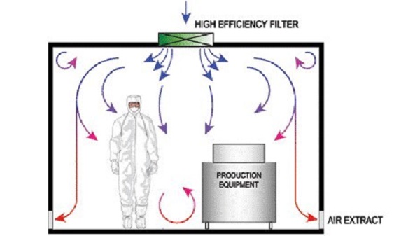 The clean air needs to pass the area’s that one attempts to keep particle-free first and being extracted (if possible) behind the people (see drawing below).