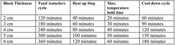 As already mentioned in section “f” (Individual block thickness), we can suggest the following autoclave cycle: