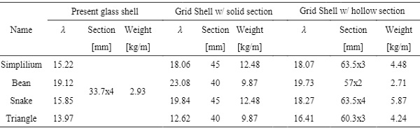 Table 3: Cross-section properties of grid shell with comparable buckling multiplier.