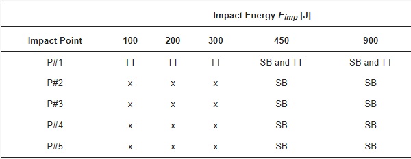 - impact point (P#n, with a fixed impact energy and impactor); and