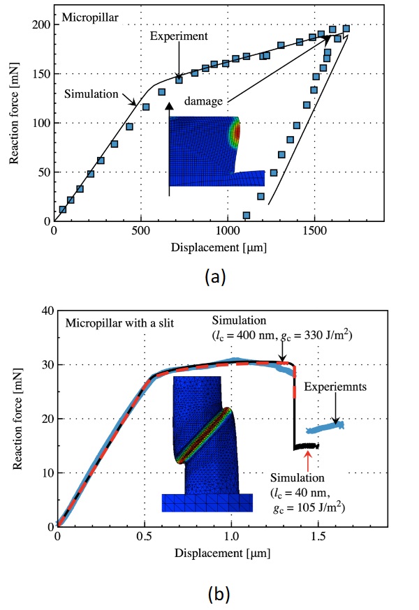The next test case involves axially compressed micropillars. Fig. 3a shows the results for a flawless pillar(Kermouche et al., 2016), while Fig. 3b presents the results for a pillar with a slit (Guillonneau et al., 2022). Both fracture patterns agree with experimental measurements. Unlike the pre-notched cantilever, multiple lc/gc pairs could be identified in this case. This is because, without an initial crack, the phase-field simulation reverts to the homogeneous solution. Significant yielding is observed in both cases.