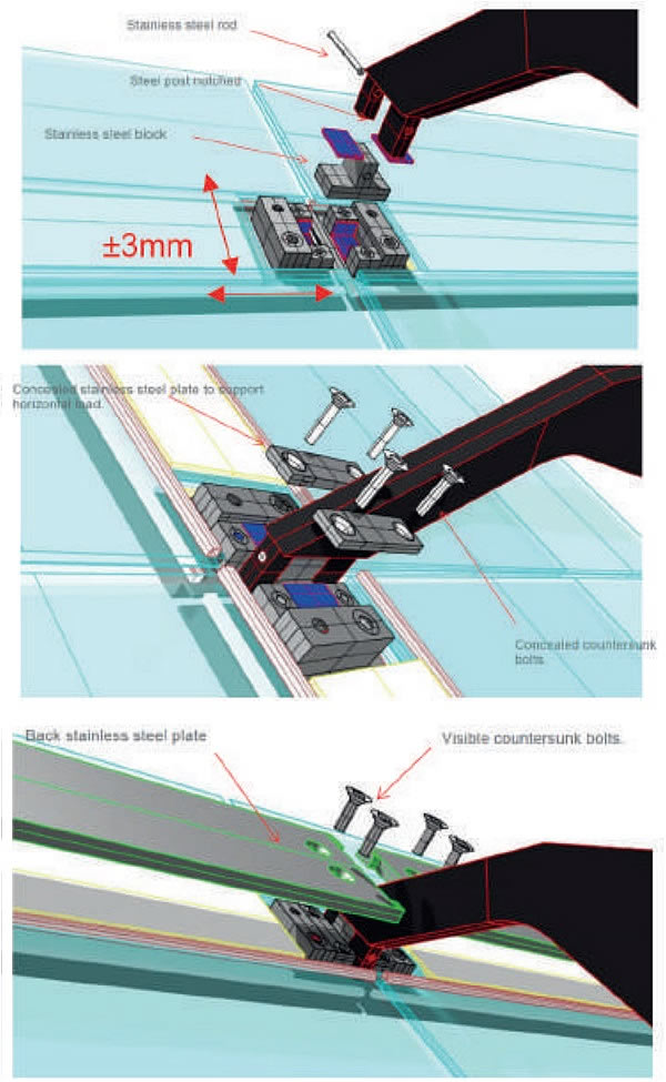 The dead load of the panels was supported by 2 or 3 (for curved glass) nylon bearing blocks per panel located on the bottom connection and also blocks on the top connection. The glass was produced with notches concealed by the capture plates, to allow for structural connection.