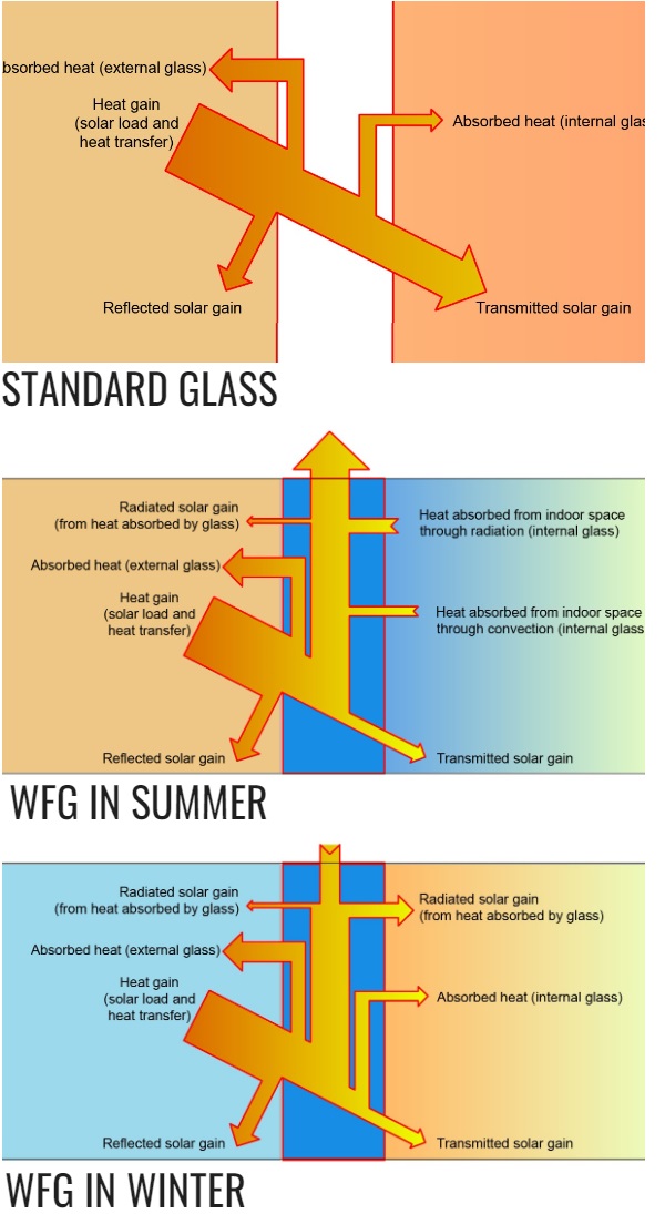- The performance of WFG in energy savings and thermal comfort gives significant freedom for architects to design glass/transparent buildings as WFG makes glass an opportunity for comfort/energy instead of being a liability (WFG provides radiant heating/cooling and energy absorption with an optically clear surface)