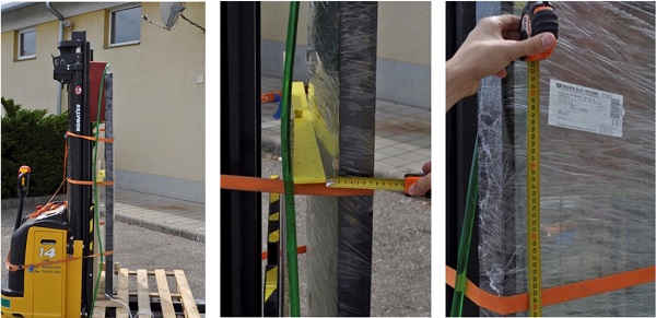 Water pressure was simulated with a load model using water weight as a uniform load, assuming a uniform pressure in the panel. This model was simulated in Glastik software, using a specific wind load that was equal to the water pressure. The results are shown in Figs. 13 - 14. The simulation was validated with prototype tests shown in Fig. 12. Laminated glass, with thicknesses of 8, 10, and 12mm, were tested. The panels used for WH02 were 820 x 1800 mm. The deformation was about 6 mm as shown in Fig. 13. This was acceptable both in terms of structure and visibility (max 0.3%).