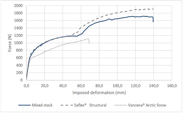 Although there are too few results to make general conclusions, it is interesting that both in tensile and in bending the mixed stack configuration seems more prone to glass breakage than for the individual interlayer specimen. A potential cause has been discussed in the section on deformation in tensile mode. In the actual frameless glass structure demonstrator, heat-strengthened glass has been used, as opposed to the annealed glass used here. Heat-strengthened glass has a much higher resistance to local stresses than annealed glass.