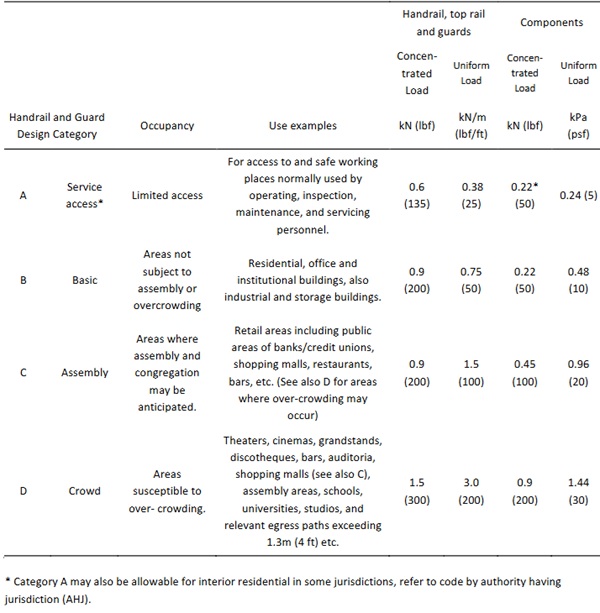 - a distributed load of 50 lb/ft (0.73 kN/m) (IBC 1607.8.1, ASCE 7, ASTM E2358),