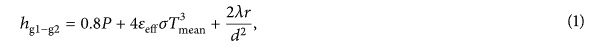 where P is internal pressure, σ is the Stefan-Boltzmann constant (5.67x10⁻⁸W/m² x K⁴), Tmean is the average of temperatures T₁ and T₂ of the glass sheets, λ is the thermal conductivity of glass pillars, r is the radius of glass pillars, d is the distance between the pillars, and the effective emittance, εeff, is conventionally written as follows: