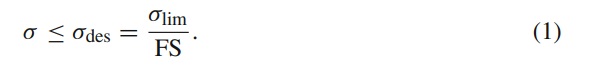 In (1), the parameter σ represents the engineering stress in the material under maximum load for the whole lifetime of the structure, σdes is the (engineering) design strength, σlim the characteristic strength of the material and the abbreviation FS stands for factor of safety. Hence, the ASD approach is also applied in ETAG 002 (2012), which regulates the design of silicone adhesive joints.