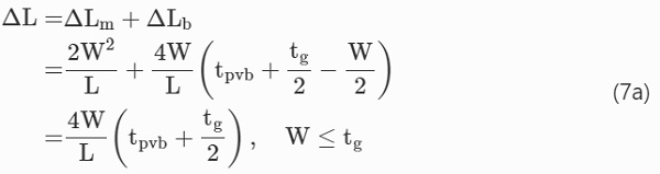 For midspan deflections greater than the top glass layer thickness (W≥tg), a pure membrane response will occur, with the extension due purely to the large deflections under the axial restraint: