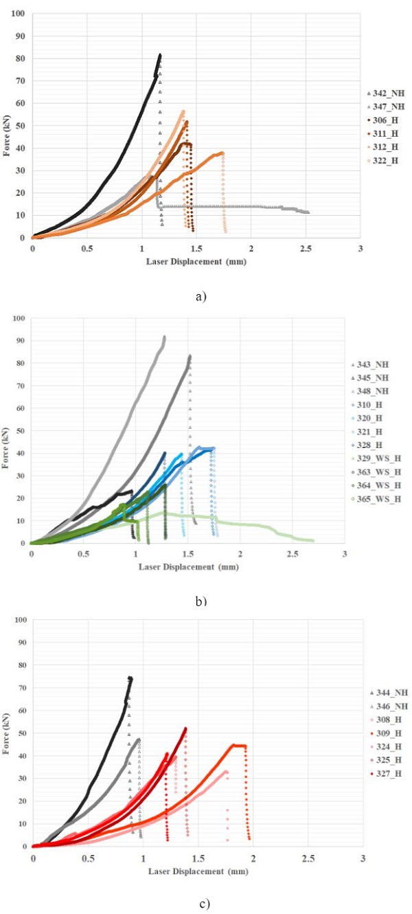 Samples 329_WS_H and 365_WS_H exhibit a non-zero plateau in the force for increasing displacement after the peak force is reached providing some evidence for progressive stable crack growth and interfacial separation, before the sample failing through glass fracture occurring to an extent that results in a loss of the sample load-bearing capacity.