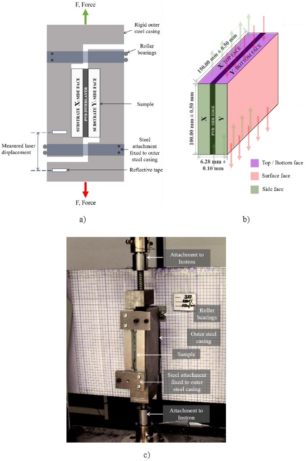The laminated glass samples were tested using the testing jig designed by the authors and shown in figure 8 on a 150kN Instron in tension mode under displacement control. The applied force on the bottom face of substrate X, shown in figure 8(a,b) leads to an equal reactive force on the top face of the substrate Y, resulting in a shear deformation of the interlayer. The side faces of the laminated glass samples were unconfined.