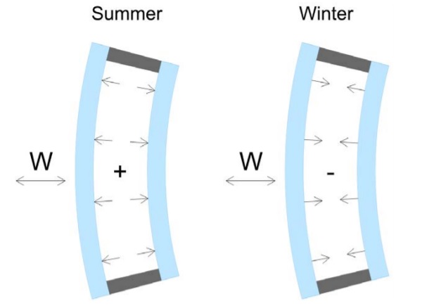 The formed gas pressure due to unequalized isocore loads in the IGU gas ranged from 0.1 kPa to 5.0 kPa in the summertime and 0.2 kPa to 8.0 kPa in the wintertime for seasonal ULS combinations. The equalization rate of 99% for the flat IGU decreased to 61% for the 120° curved IGU (Figure 5). The resulting isochore pressures exceeded the magnitude of wind.