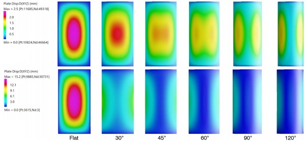 Flat glass supported on 4 edges developed a stress field located at the center of the pane. With curvature, peak stress fields were observed to redistribute from the center and concentrate along perimeter regions (Figure 6).