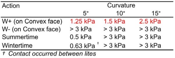 To understand if the glass will buckle from a single action, this can be a valuable first step prior to checking all load combinations. The buckling study showed that wind loading applied opposite the direction of curvature led to the onset of buckling at a load less than the ULS design wind load. In addition, the shallow 5° IGU exhibited buckling under isochore pressures. Loads applied in the same direction as the curvature did not lead to buckling. It should be noted that given the limited number of cases studied in this effort, a sensitivity study on buckling effects is warranted for other IGU sizes or thicknesses.