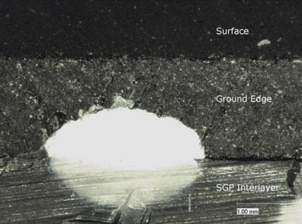 The microscopic image below shows the frit taken right to the edges of the glass including the chamfered edge. It was becoming obvious that this was an issue and causing premature failures of the assembly. In addition, the specimens taken from site were opened up at the crack line to examine the fracture patterns and evaluate potential causes. These examinations also confirmed that the issues arose at the frit location directly at the edges of the glass panels.