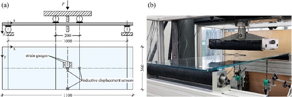 Four-point bending tests according to (DIN EN 1288-3:2000-09 2000) examine the load-bearing behaviour and calculate the linear composite stiffness and glass stress response. Minimum five test specimens per series were loaded up to a force level of 400 N (load application speed of 400 N/min) at +23 ∘C. A detailed description and evaluation of composite load-bearing tests are presented in (Hána and Weller 2019b). Axial strain gauges on the glass surfaces (centre top and bottom) and vertical displacement sensors in the centre, centre edge and below one bending roller (see Fig. 14) recorded the strains in x direction and deflections in z direction. Two series, 1ANG-6PMMA-1ANG and 2ANG-6PMMA-2ANG, were tested. Monolithic 8 mm (FTG) thick glass and laminated glass composed of two layers of 4 mm ANG with a standard PVB interlayer with a thickness of 0.76 mm (LG 44.2 - PVB) were tested to compare the load-bearing behaviour to conventional glass panels.