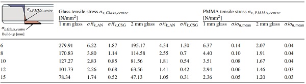 To classify the results, the decisive tensile stresses of PMMA and glass are evaluated and compared to the characteristic material strength. Table 10 presents the decisive tensile stresses (force level F = 2000 N) at the centre-span cross section and evaluates the individual strength utilisation.