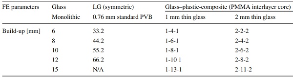 Glass–plastic-composite panel build-up parameters are defined ranging from 6 to 15 mm nominal total thickness following conventional standardised thicknesses for glass (DIN EN 572-1:2016-06 2016). The material assumptions and simulation properties are described in Sect. 4.3. Symmetric laminated glass with standard PVB and monolithic glass serve as a reference. All parameters are summarised in Table 9.