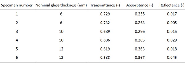 The observed consistency in thermal boundary conditions and resultant outcomes across specimens of identical thicknesses emphasises the reproducibility facilitated by the electric radiant panel. Moreover, the analysis reveals a positive correlation between absorptance and nominal glass thickness, attributed to in-thickness absorption phenomena. This leads to a declining trend in transmittance with increasing thickness. Additionally, the reflectance values exhibit no apparent trend, consistent with the surface-confined nature of reflectance phenomena.