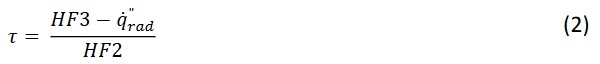 Assuming absorption and emission effects are lumped at the surface, the transmittance is determined by the ratio of the transmitted heat flux to HF2, as shown in Equation (2).
