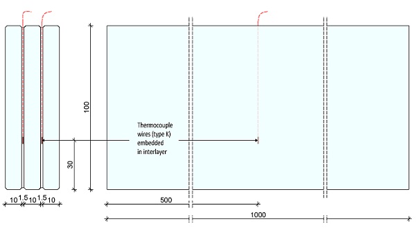 To measure the temperature during the fire tests every glass beam had two thermocouple wires embedded in every interlayer. Regular soda-lime silica glass was used in this research. Eight specimens were tested. To examine the influences of different glass types, interlayer types and load level, multiple combinations of specimens were tested in this research. Table 2 shows the overview of the specimens. The study included three different glass types, annealed (ANG), heat strengthened (HSG) and fully tempered (FTG) glass. Additionally, regular Polyvinylbutyral (PVB) and SentryGlas® interlayer was applied in the laminated glass. Due to the use of a small furnace, four specimens could be tested in one run. Therefore, the eight specimens were tested in two test runs.