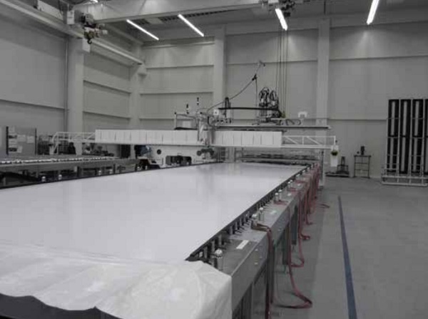These connector elements can be positioned along the machine bed within a 1/10 mm. Following positioning of the adjustable connectors using a high precision measurement equipment the elements have been grout locked in position to eliminate the risk of position errors during mass production. The tables allow for exact positioning of the glass units, using setting out references. As glass in the sizes used for the process in itself is tolerance afflicted, a setting out edge has been agreed on. All glass tolerances have been pushed to defined joints. A flexible edge evacuation was designed, able to account for glass tolerances, minimizing any follow up works.