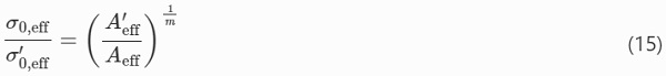 The strength-scaling effect when the flaw populations and environmental conditions are otherwise held constant is expressed as follows where σ₀,eff is the scale factor corresponding to Aeff and σ′₀,eff to A′eff, respectively.