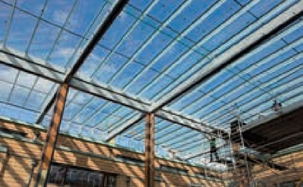 First major project with fins of different lengths and angles in the roof was for the Victoria & Albert Museum in London, arch. Muma, engineer Tim Mc Farlane, where insulated and laminated glass panels were forces in warped form in the fins. For that purpose the fins got a stainless steel top profile so that local tensions form twisting the roof panels would be distributed more evenly on the glass fins. The translucent PVB film in the laminated beams resulted in an astonishing beauty from the beams as wings.