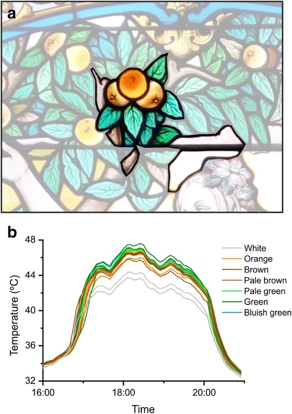 Regarding the color of the glass, the chromophores can modify the glass heating by absorbing some of the solar energy and diminishing energy transmission [44]. It was observed that those areas with higher temperature were, principally, the greenish glasses from the vegetation (Fig. 4b, c). It is not easy to compare the glasses from different areas of the window because of their different exposure to natural solar radiation. Nevertheless, the analysis of a local area with different colored glasses (Fig. 6a) confirmed that the greenish glasses presented a slightly higher temperature than the orange ones during the period of solar radiation (Fig. 6b). This temperature variation is higher than the incertitude of the measurement. It was also observed that the colorless glasses were the coldest ones.