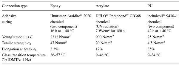 Table 1 Adhesive properties according to (DELO Industrial Adhesives 2019; Huntsman Advanced Materials GmbH 2012; Ruderer Klebetechnik GmbH 2018; Wünsch 2017; Wurm 2007) and unpublished master’s thesis from the Institute of Building Construction, Technische Universität Dresden - Full size table