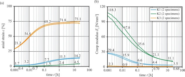 The creep modulus of K3 lowers from 2.3 N/mm2 (0 s) to 0.68 N/mm2 (24 h). The strain increases to a maximum of 73.1%.