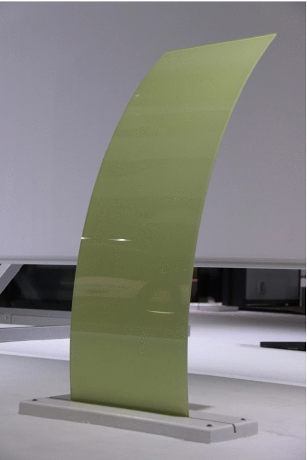 In addition to the numerous advantages, such as weight and material savings, cost reduction and simplified production, the material combination of FRP and glass offers further great potential: Previous ventilated rain screen façades made of glass and a conventional carrier plate were exclusively available in flat design. The newly developed glass-FRP composite offers the possibility to construct curved elements, since the FRP material is geometrically unrestricted. Figure 17 shows an example of such a curved element.