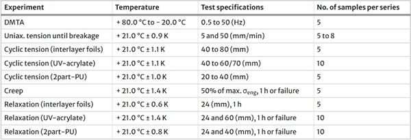 These considerations underscore the necessity for further investigation into the realm of liquid cold-poured adhesives, especially at high strains, which serves as the topic of this paper. The main focus is therefore initially on the uniaxial tension stress state. The temperature-dependent behavior of the materials is investigated and compared using Dynamic-Mechanical-Thermal Analysis (DMTA). Furthermore, material tests are conducted in four different specifications: tensile tests up to breakage, cyclic tests, creep tests, and relaxation tests. These tests can be carried out easily, provide detailed information about the general material behavior, and ensure precise comparability with other interlayer materials.