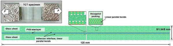 The DE model of TCT specimen adopted a hexagonal packing strategy for the glass sheet and an expansive particle packing method for PVB interlayer. The theoretical solutions to approximate the elastic property of isotropic material using hexagonal packing can be found in (Ismail et al., 2015). The equations for contact stiffness are given as: