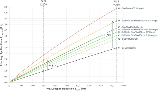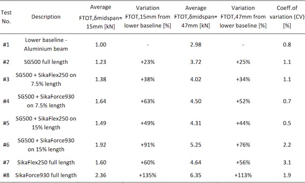 - Sample series #6 with SikaForce930 at 450mm (15% of the beam length) at each side of the beam and standard structural silicone in the remaining joint demonstrated an average improvement in applied force of 91% at the serviceability limit state in comparison to the baseline.