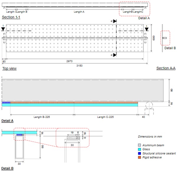 - Assess different bonding layouts and the efficacy of using two different materials in one member, i.e. conventional structural silicone and rigid polyurethane adhesive;