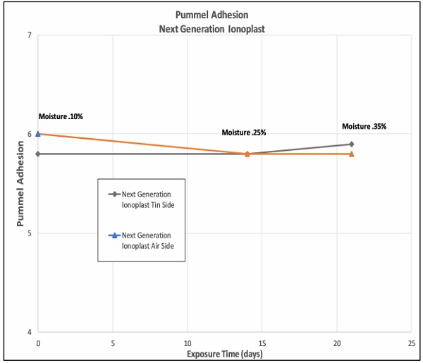 Next generation Ionoplast showed very little weight loss and a high pummel value with air side orientation indicting very high glass retention. The tin side orientation results were slightly lower with a increase in weight loss seen at a moisture of .6%.