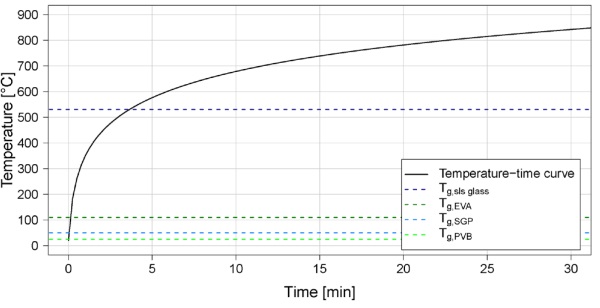 Due to the amorphous properties soda lime silicate glass has no melting point. It has a transformation temperature at which the material changes from a solid to a viscous state. This point is about 530 °C ([5], p.9). For polymeric interlayers like polyvinyl butyral (PVB) this temperature is called glass transition temperature. PVB reaches its glass transition temperature already at room temperature ([5], p.98), ionoplast interlayers, such as SentryGlas® (SGP) at about 50 °C ([6], p.94) and ethylene vinyl acetate interlayer (EVA) at about 110 °C [7]. Figure 2 shows the standard temperature-time curve in black colour. The transformation temperature of soda lime silicate glass as well as the glass transition temperature of EVA, SGP and PVB are represented in the figure as horizontal lines. In comparison with the temperature-time curve, the glass transition temperature of the interlayer materials is too low for a significant influence on the load-bearing behaviour of laminated glass or laminated safety glass. The temperature-time curve reaches the transformation temperature of soda lime silicate glass within the first 5 min. The overview shows that the loadbearing behaviour of laminated safety glass in case of fire is limited by the transformation temperature of the used glass type as the interlayers glass transition is transcended at very low temperatures.