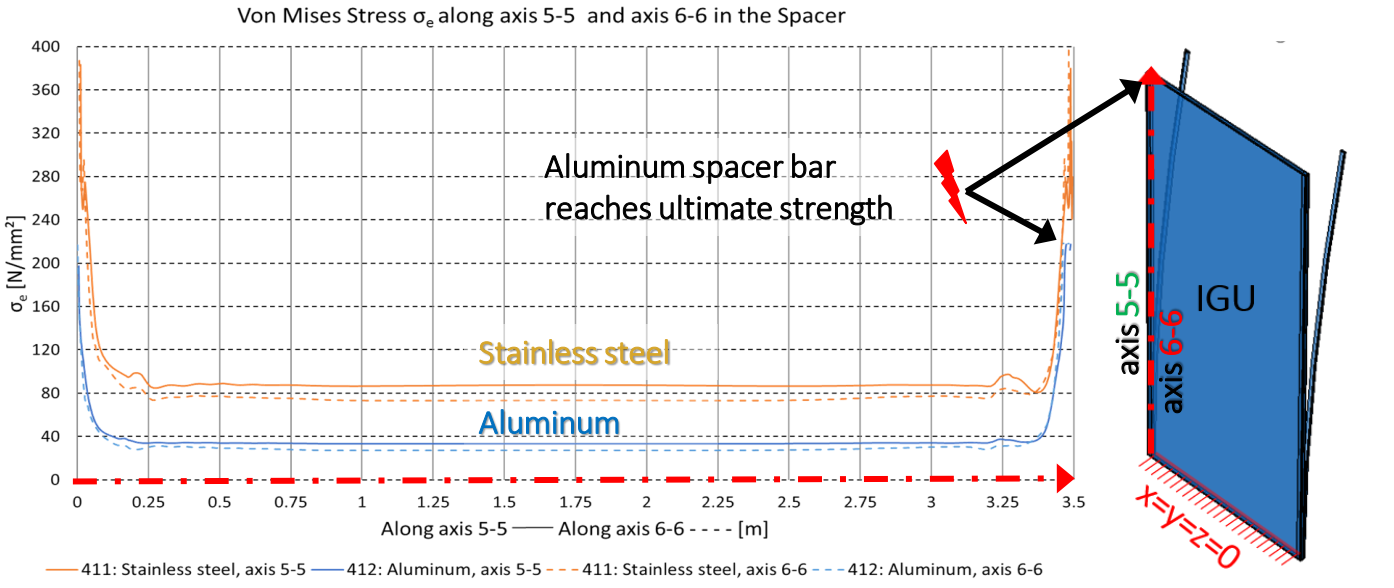 Aluminum spacers are preferred over stainless steel spacers for IGUs. A variation of the spacer materials shows, that the stainless steel spacer is more suitable than the aluminum spacer because of it's higher ductility. Besides the high material utilization, a further problem shows up when looking at the local deformation of the spacer in the x-direction, which is also illustrated in the figure below.