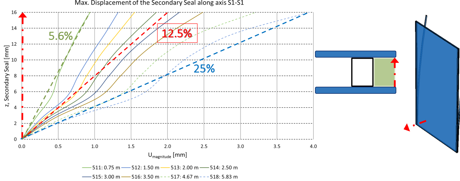 Special attention should be given to the secondary seal's shear deformation in the case of cold-bent IGUs. This can be solved with high performing silicones, however elaborate approval procedures shall ensure the airtightness of the cavity. In the depiction below, the shear deformation of the secondary seal of an IGU with different lengths is compared. All other parameters are as desribed in the reference model above. The shear displacement of the secondary seal increases as the IGU gets longer. For an IGU with the dimensions of 1.5x3.5 meters, the shear displacement is 12.5% which is pushing the boundary of what is feasible with today's silicones.