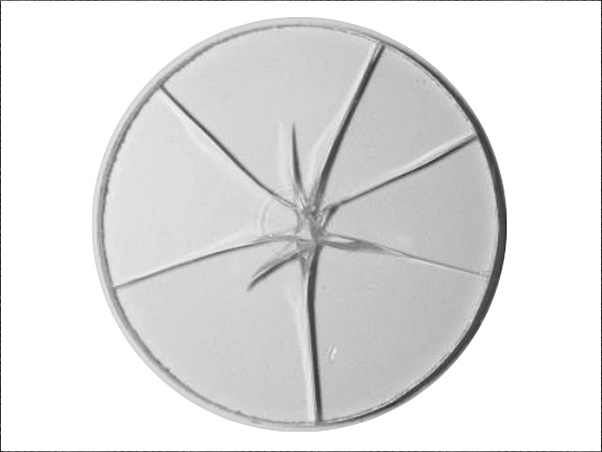 Not only is the loading path and the failure load of interest in the validation of the numerical fracture models but also their ability to form realistic failure patterns (to some extent). As it was impossible to keep the fractured glass specimens in one piece after testing at the high loading rates, the images of the fracture patterns provided in Fig. 8 are from representative specimens tested at the lowest target piston velocity of 1.7∙10-3mm/s. It is evident that the number of fragments increases with fracture strengths, which is caused by the increasing strain energy stored in the glass (Haldimann et al. 2008). In terms of strain-rate, this also means that a lower strain-rate should lead to fewer fragments compared to a higher one at which the strength is assumed to have increased.