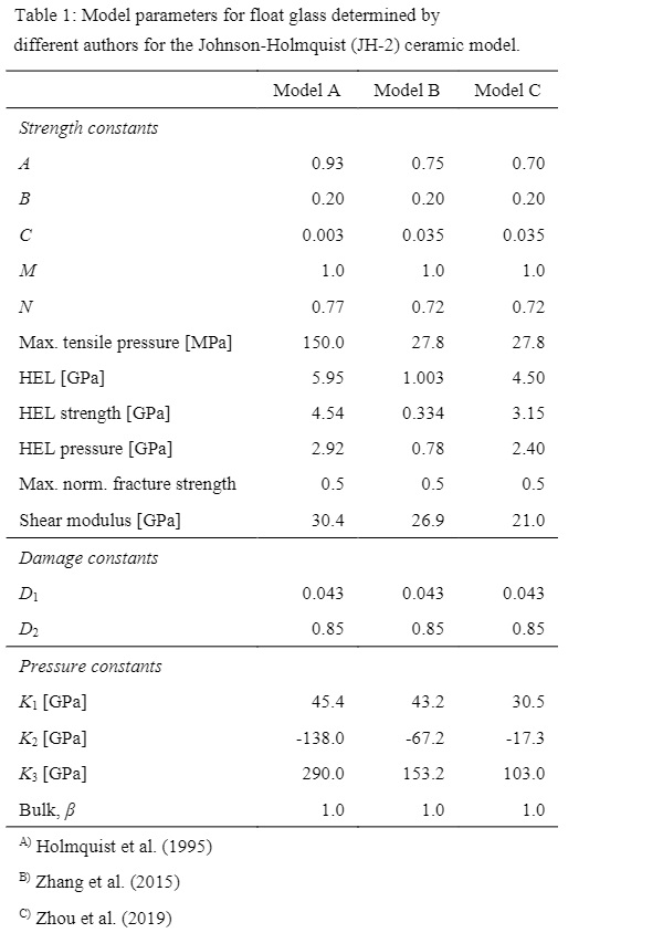 However, no plate impact experiments were conducted to obtain the HEL. Instead, they introduced a pseudo-HEL, which is taken as the maximum uniaxial strength and the associated pressure value from the split Hopkinson pressure bar tests. Their proposed model parameters are given in Table 1as well, hereinafter referred to as Model B.A newly published article (Zhou et al. 2019) discussing the application of the JH-2 model for the damage assessment of float glass under blast loading, proposes a further set of model parameters where the parameters from Zhang et al. (2015) are combined with the findings from Holmquist et al. (1995) and other available test results. The obtained parameters are summarised in Table 1 under Model C.