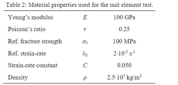 An increase in the number of fragments due to an increased fracture strength with loading-rate could not be captured by the simulations. It is concluded that the smeared crack model is too simple and not appropriate for the simulation of blast-related engineering problems due to the missing strain-rate dependency. Therefore, an initial step in the development of a simple failure model that includes a strain-rate dependent material strength has been proposed. As only an immediate element removal is applied, the model shows some instabilities where elements fail in areas that are not part of the main crack formation, due to stress wave reflections.