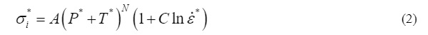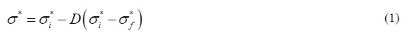 where σi* is the normalized intact strength, σf* is the normalized fractured strength, and D is a damage variable ranging from 0 (intact) to 1 (complete fracture). All the normalized equivalent stresses have the general form σ*=σ/σHEL, where σ is the actual von Mises equivalent stress and σHEL is the equivalent stress at the Hugoniot elastic limit (HEL), at which a one-dimensional (uniaxial strain) shock wave exceeds the elastic limit of the material. Strain-rate effects are directly considered in the formulation of the intact and fractured material strength that is given by: